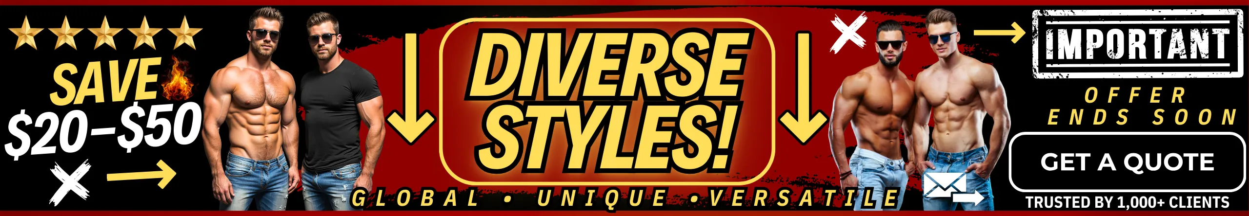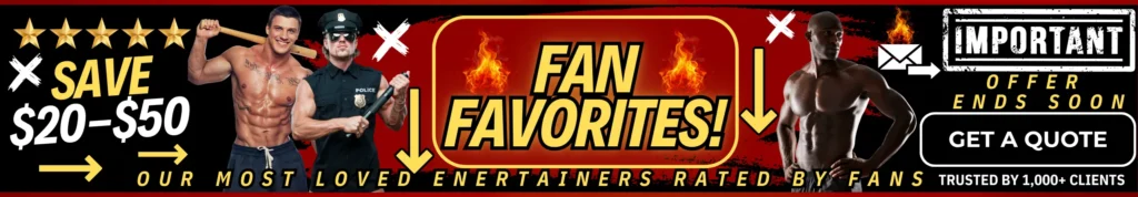 Discover our most popular entertainment choices—from high-energy male strip shows to buff butler service, shirtless bartenders, party bus performers, and so much more—all available at special discounted rates.